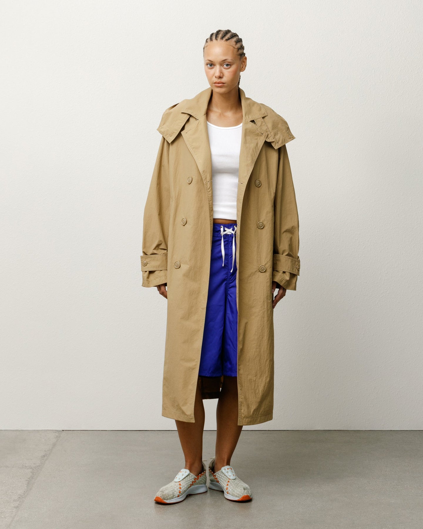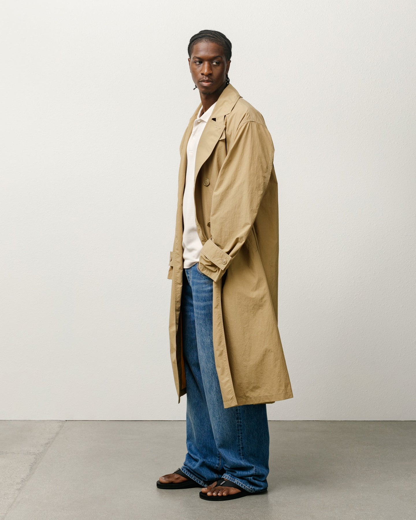 • Relaxed fit trench coat in a lightweight and water-resistant nylon cotton blend