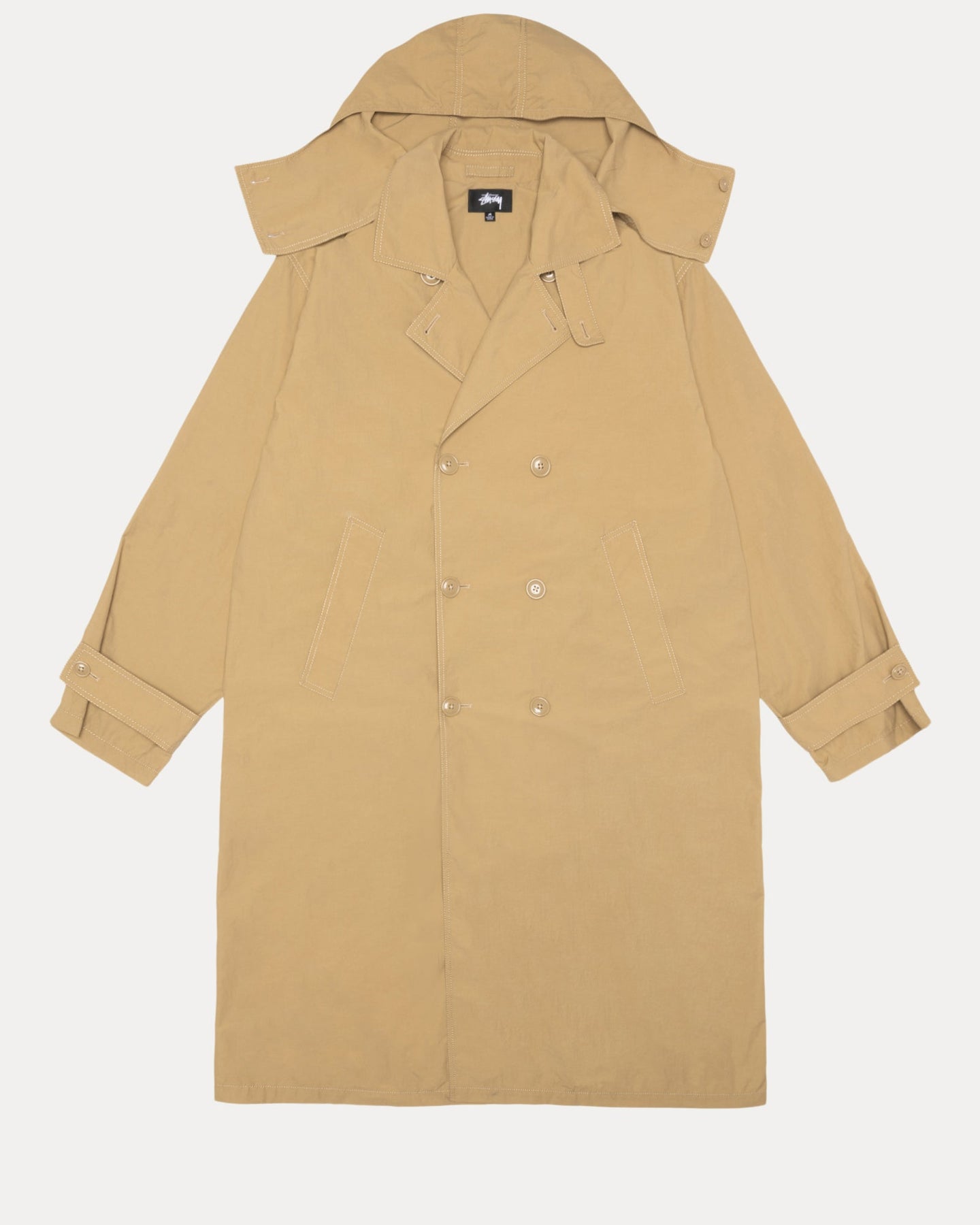 • Roomy, double breasted silhouette with a detachable hood and welt pockets