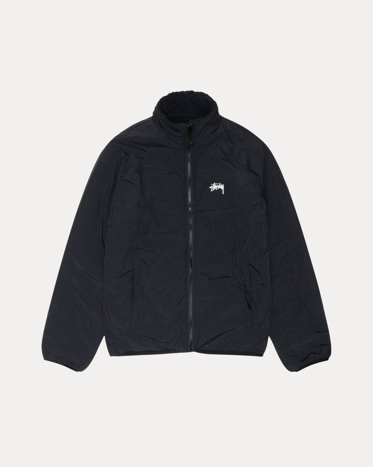 • Sherpa fleece exterior with a zip closure, nylon pockets and Stüssy stock logo embroidery